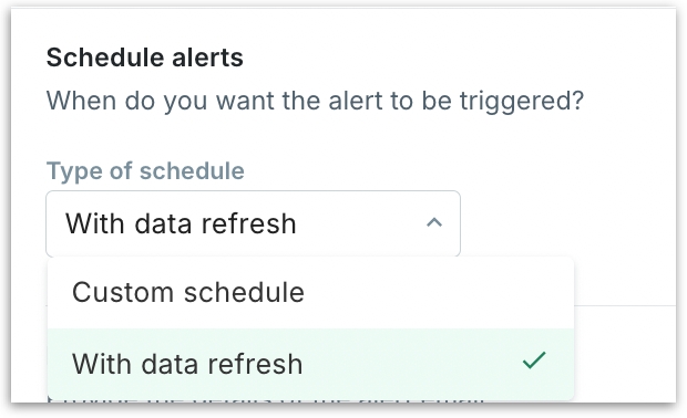 Custom schedule: Choose this if you want the alert to trigger on a specific cadence—like daily at 9 AM, every Monday, or on the 1st of each month—regardless of when the data was last refreshed. Provide the required start date, time, and frequency.