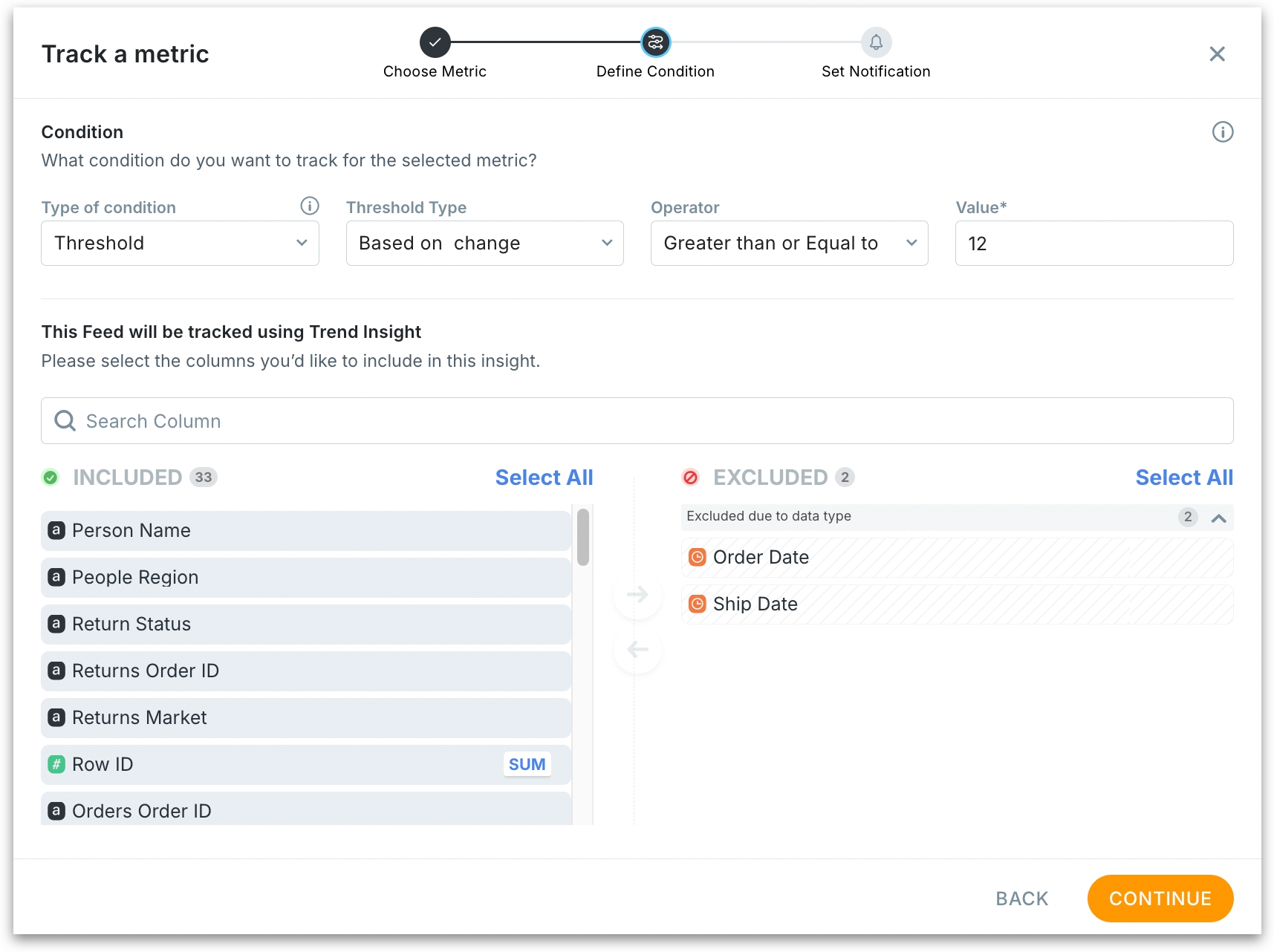 Choose which columns to include in the Insight generation. Tellius will use these to explain why a trend is happening by breaking down metric behavior across these columns.