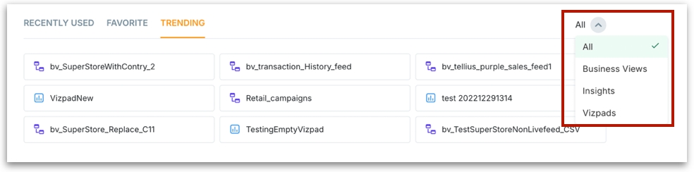 Use this as a launchpad for different artifacts (Vizpads, Insights, Business Views) instead of searching or browsing through multiple modules. These lists auto-refresh based on your activity and organization-wide usage patterns. Each tab can be filtered based on the artifact type.