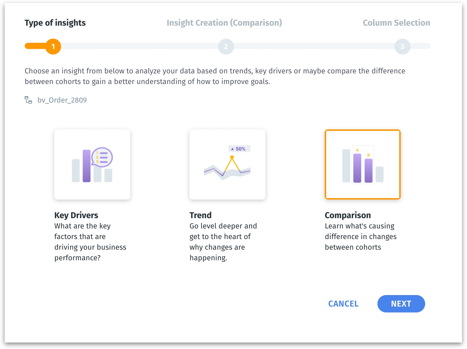 As a first step, choose Comparison as the type of Insight you want to generate. Click on Next.