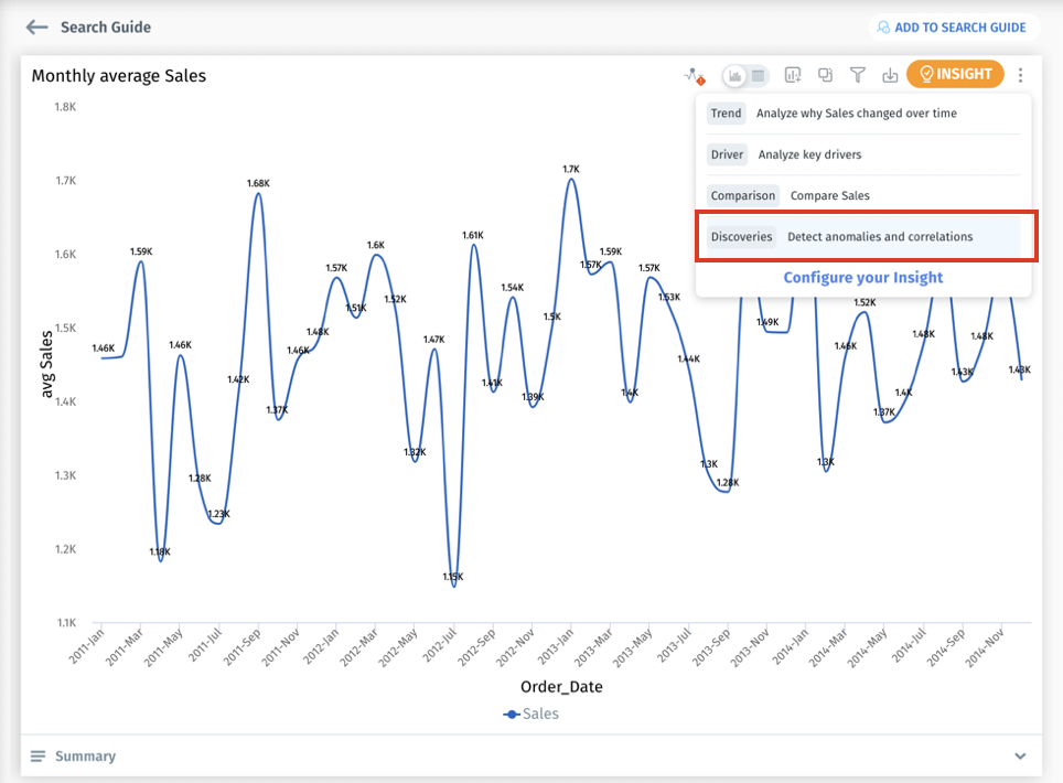 1. Under the tab **Search**, execute a search query. For example, consider the search query "*Show me monthly sales*".