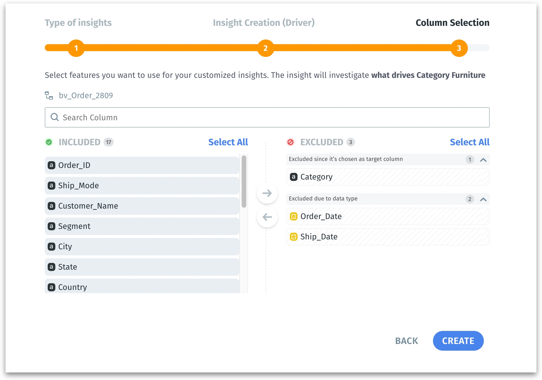 Deciding which columns to include or exclude should be strategic. In the above example, "Order_Date" and "Ship_Date" are excluded due to their data type (date), which could be unsuitable for the specific driver analysis.