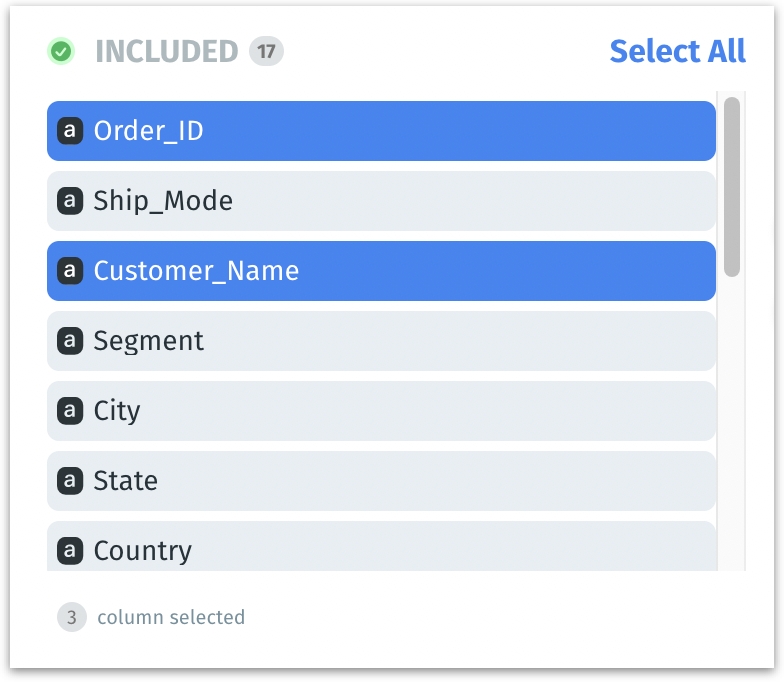 In the Included section, select the columns you want to exclude. As you select, you can find the number of columns selected highlighted at the bottom.