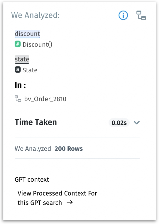 Once a query is executed and the results are displayed, you can find details of the analysis (columns, Business View, and the number of rows analyzed along with the time taken to execute the query) under Search Inspector. You can also thumbs up/thumbs down the analysis as preferred.