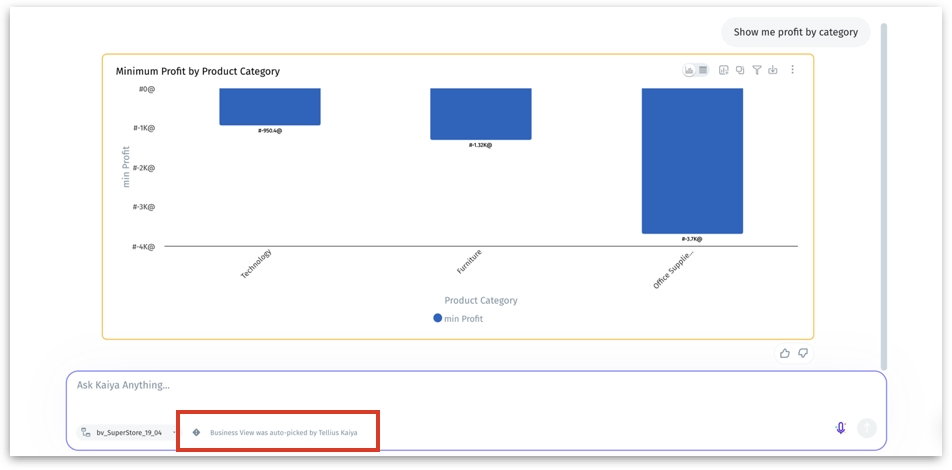 The results will be displayed. You can find "Business View was auto-picked by Tellius Kaiya" near the selected BV.