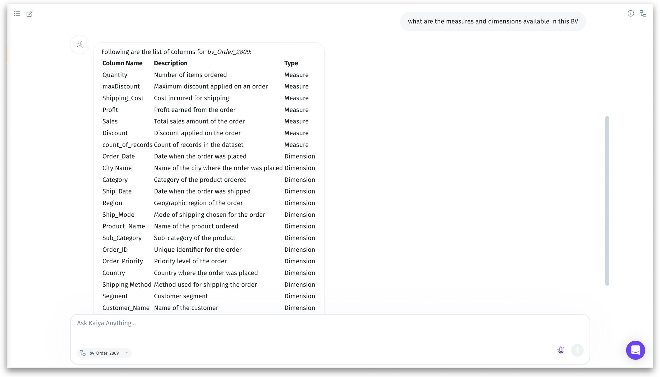 Kaiya provides a structured table listing the columns in the BV, categorized as measures and dimensions.