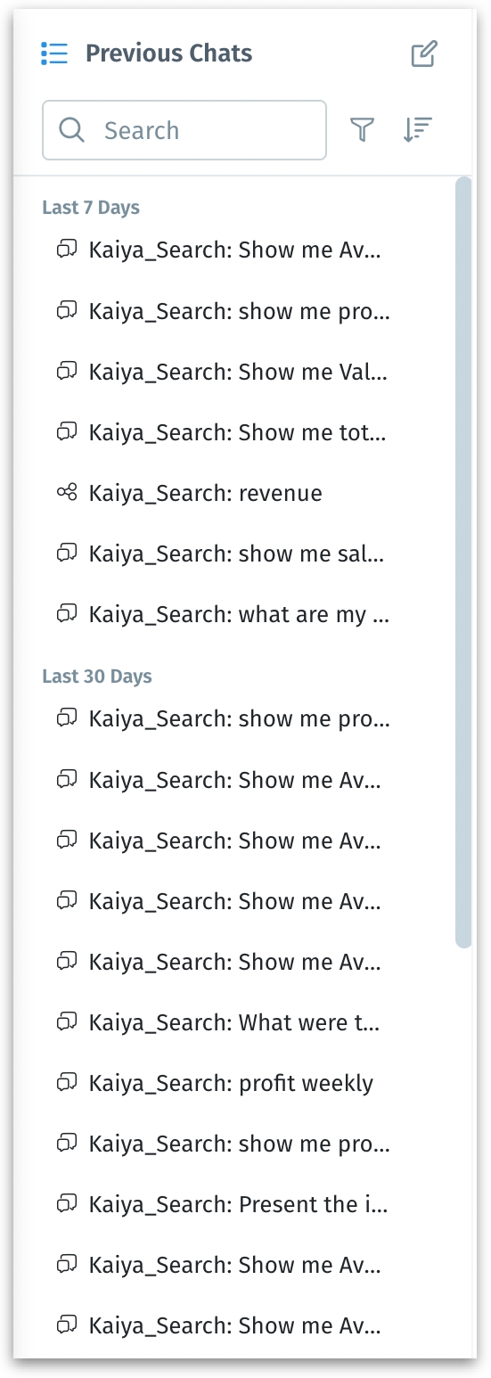 b. Click on the Previous chats icon to view the history of conversations. Search, sort, or apply filter to view all the chats, your chats, or the ones shared with you.