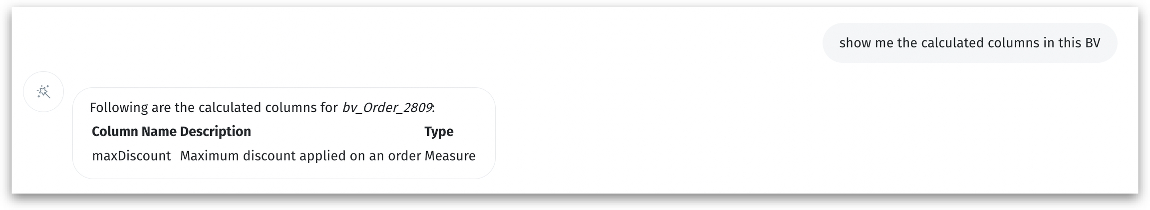 Kaiya answers natural language questions about metadata—such as measures, dimensions, calculated columns, and date fields—so that you can quickly uncover key details about your Business View (BV) without technical expertise. Whether you're a business user trying to understand data relevance before diving into analysis or an analyst seeking granular technical details, Kaiya bridges the gap between technical metadata and business context.