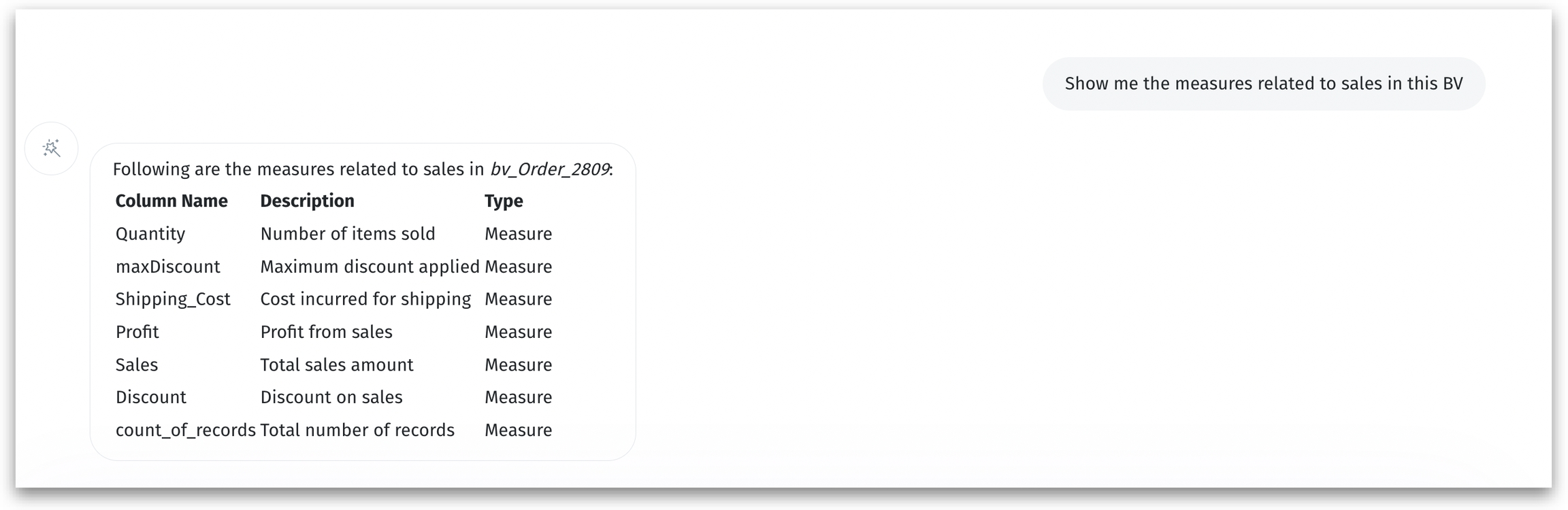 Metadata queries accelerate data discovery, empowers non-technical users, and reduces the back-and-forth between teams. You can ask questions about the structure and content of your dataset (BV) to: