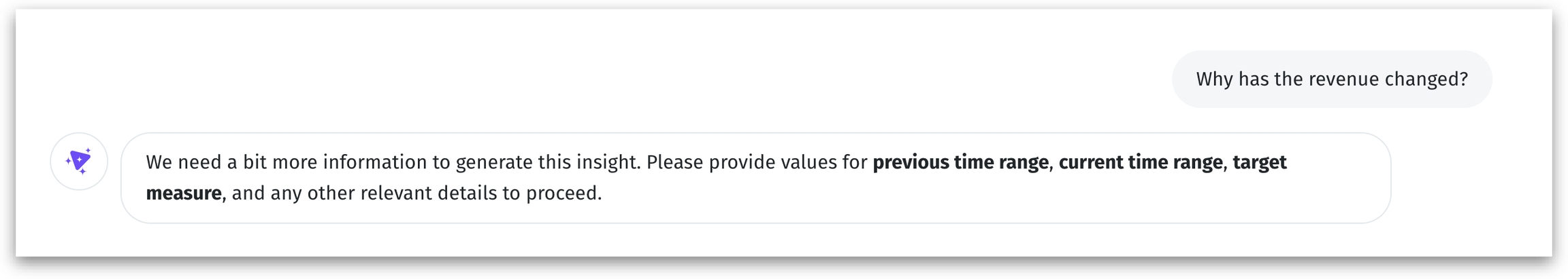 If required inputs (like time ranges or target metrics) are missing, Kaiya will prompt you to provide: