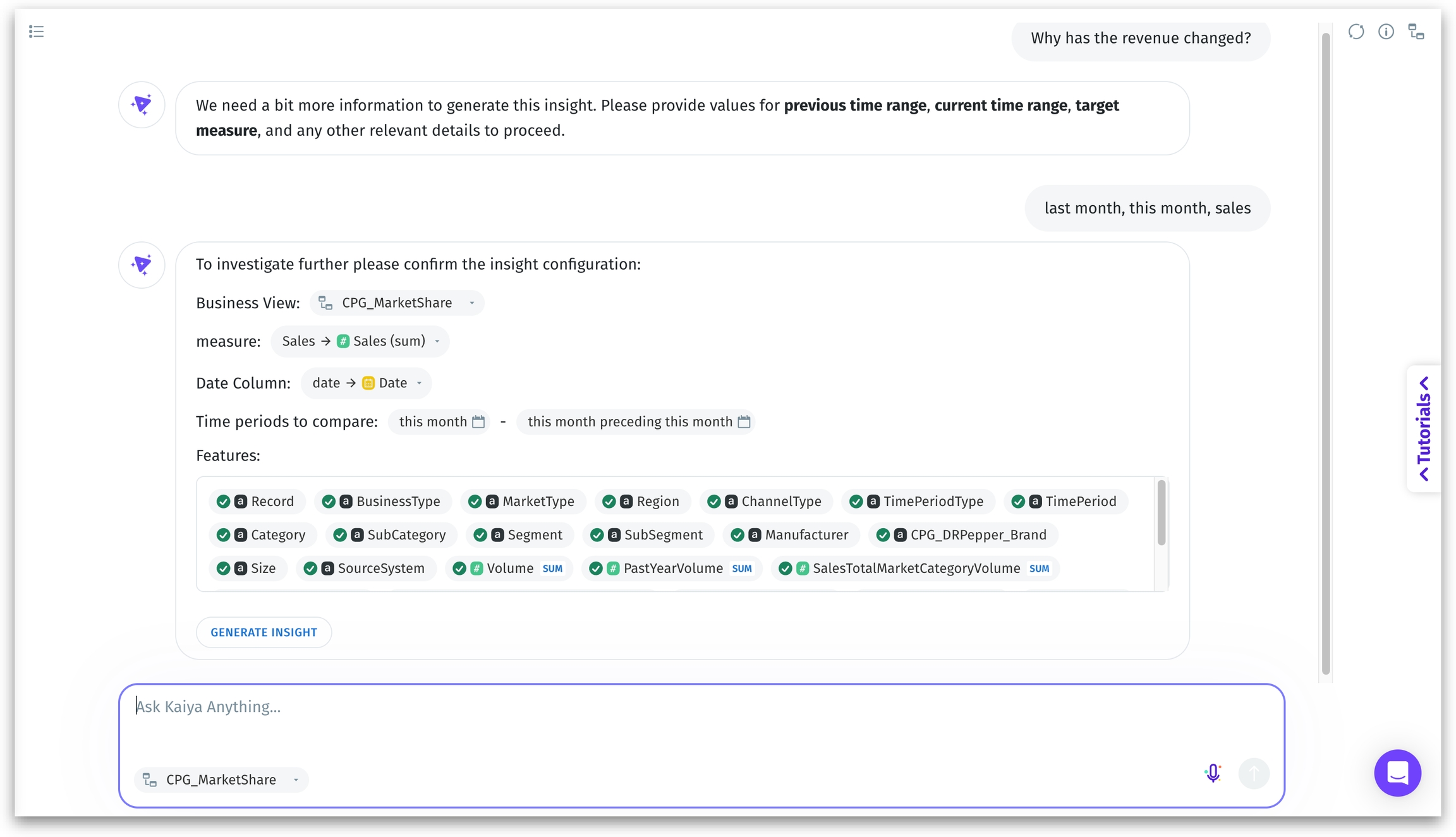 Kaiya supports automated insight generation via natural language "why" questions (e.g., “Why has revenue changed?”). When such a question is asked, Kaiya internally triggers the Insights Agent, configures a comparative analysis, and populates insight settings automatically—without requiring manual setup or pre-configuration in Composer.