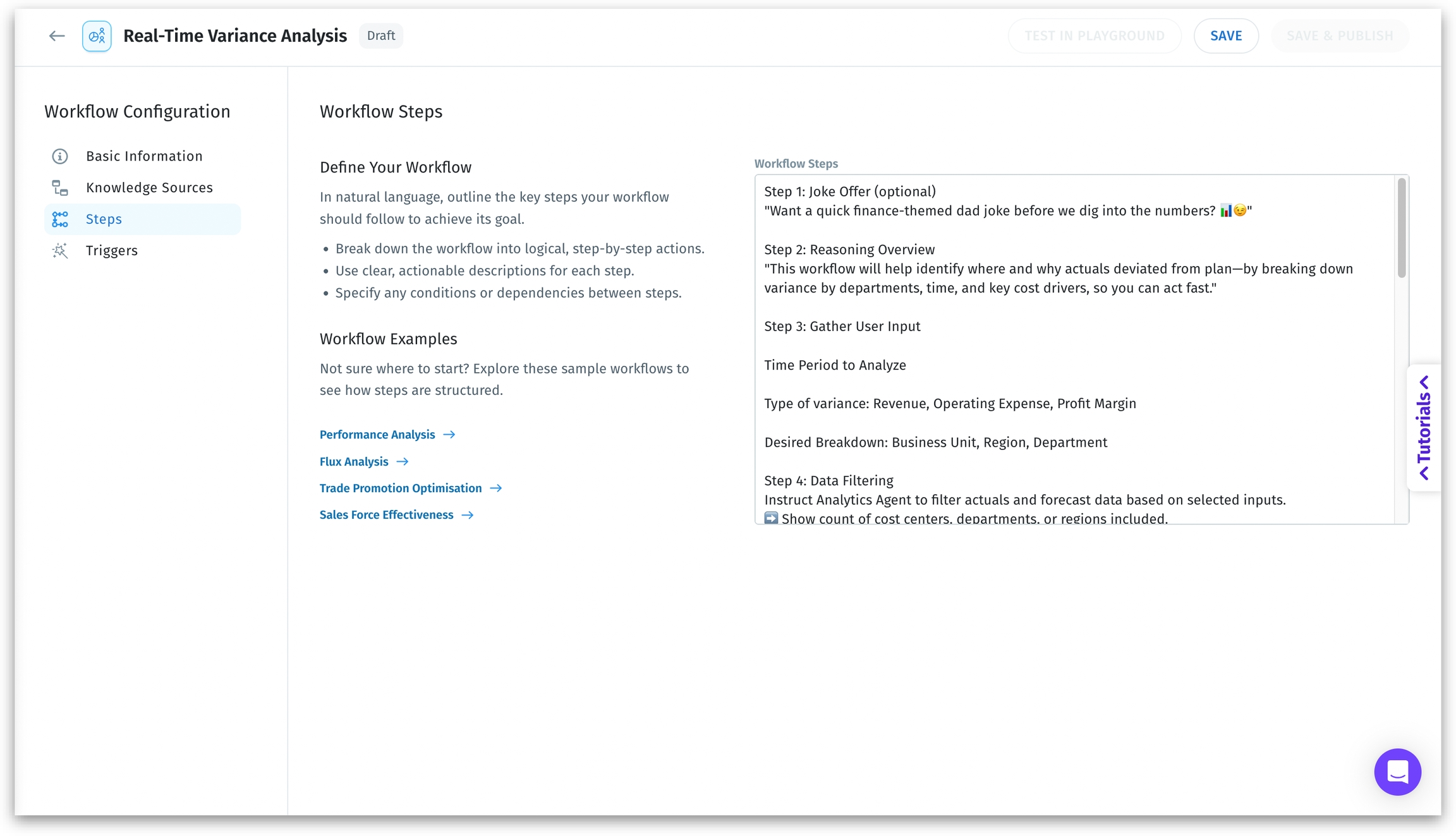Define the logic of your workflow in natural language steps. Each step maps to one or more AI Agents (e.g., Planner, Data Prep, Insights). Links to ready-made example flows are available. Click on any sample analysis to view the workflow steps.