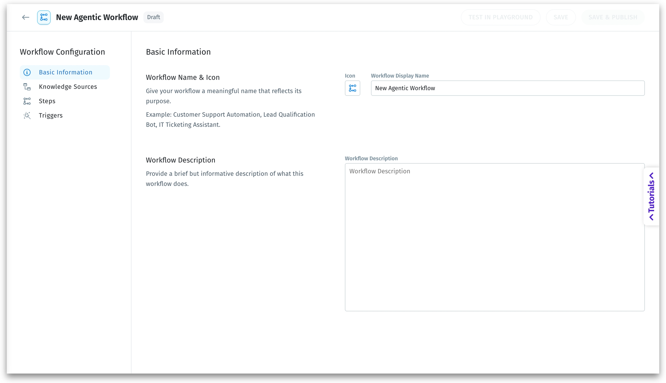 Set up the foundational identity of your Agentic Workflow—its name, icon, and a short description of what it does.
