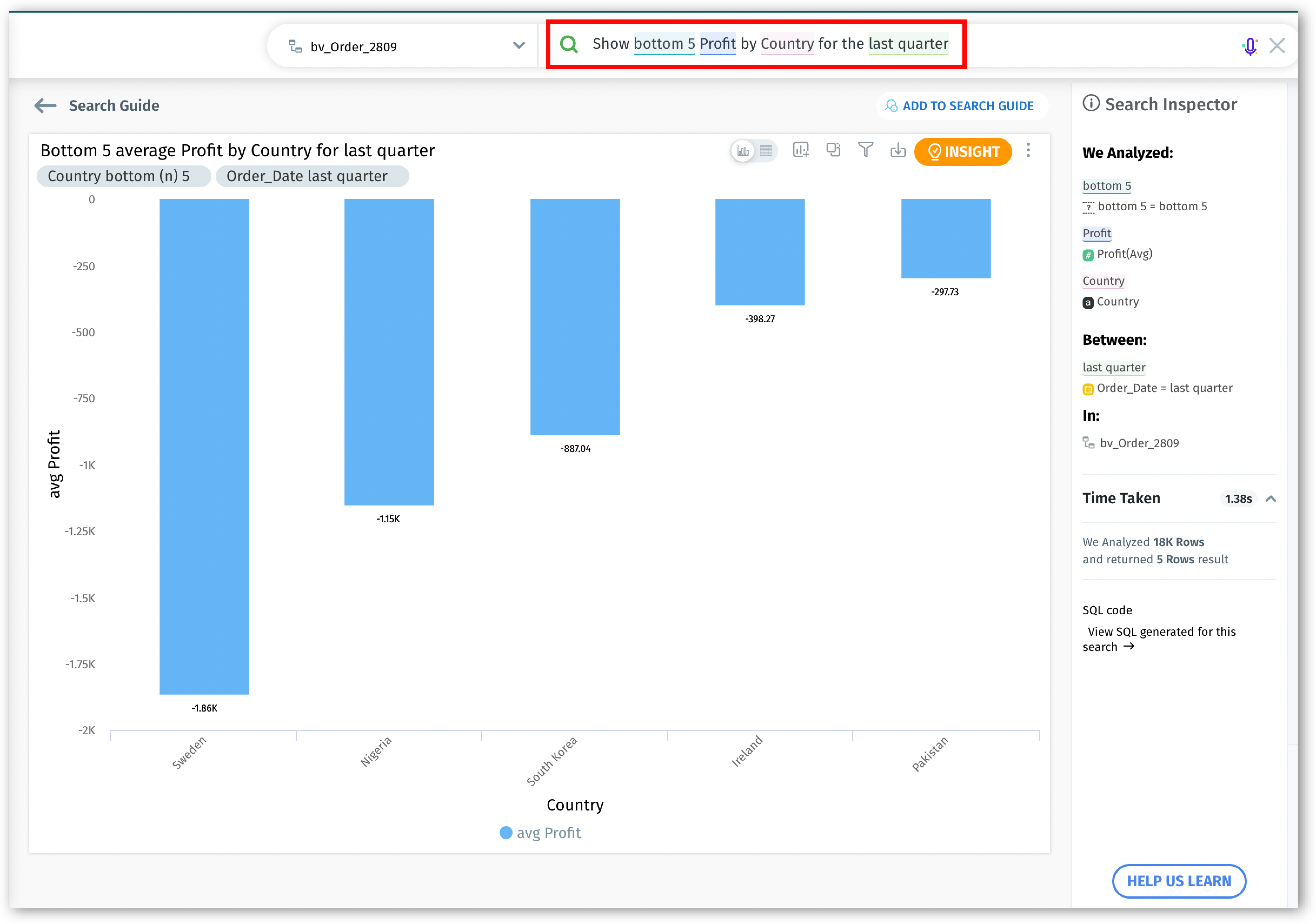 <figure><img src="https://content.gitbook.com/content/z4Tm2IzKyAiWUWiskgq5/blobs/5ARXC6ov8Ze8Vu81eyM0/Frame%205.png" alt="" width="375"><figcaption><p>"<em>Show bottom 5 Profit by Country for the last quarter."</em></p></figcaption></figure>