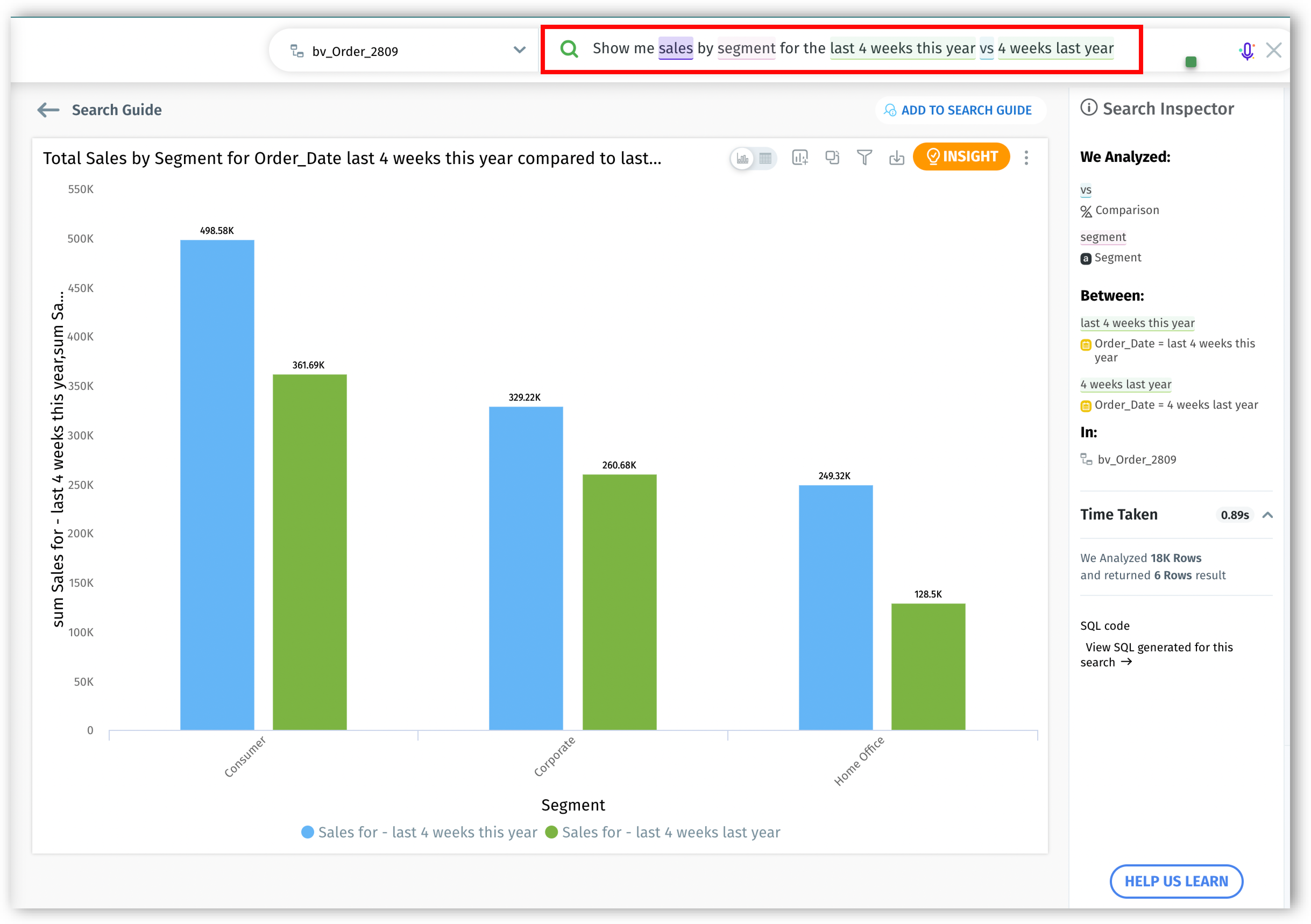 <figure><img src="https://content.gitbook.com/content/z4Tm2IzKyAiWUWiskgq5/blobs/EK9WaWkCZxLZLXAEl2jI/Frame%2019.png" alt="" width="375"><figcaption><p><em>"Show me sales by segment for the last 4 weeks this year vs 4 weeks last year"</em></p></figcaption></figure>