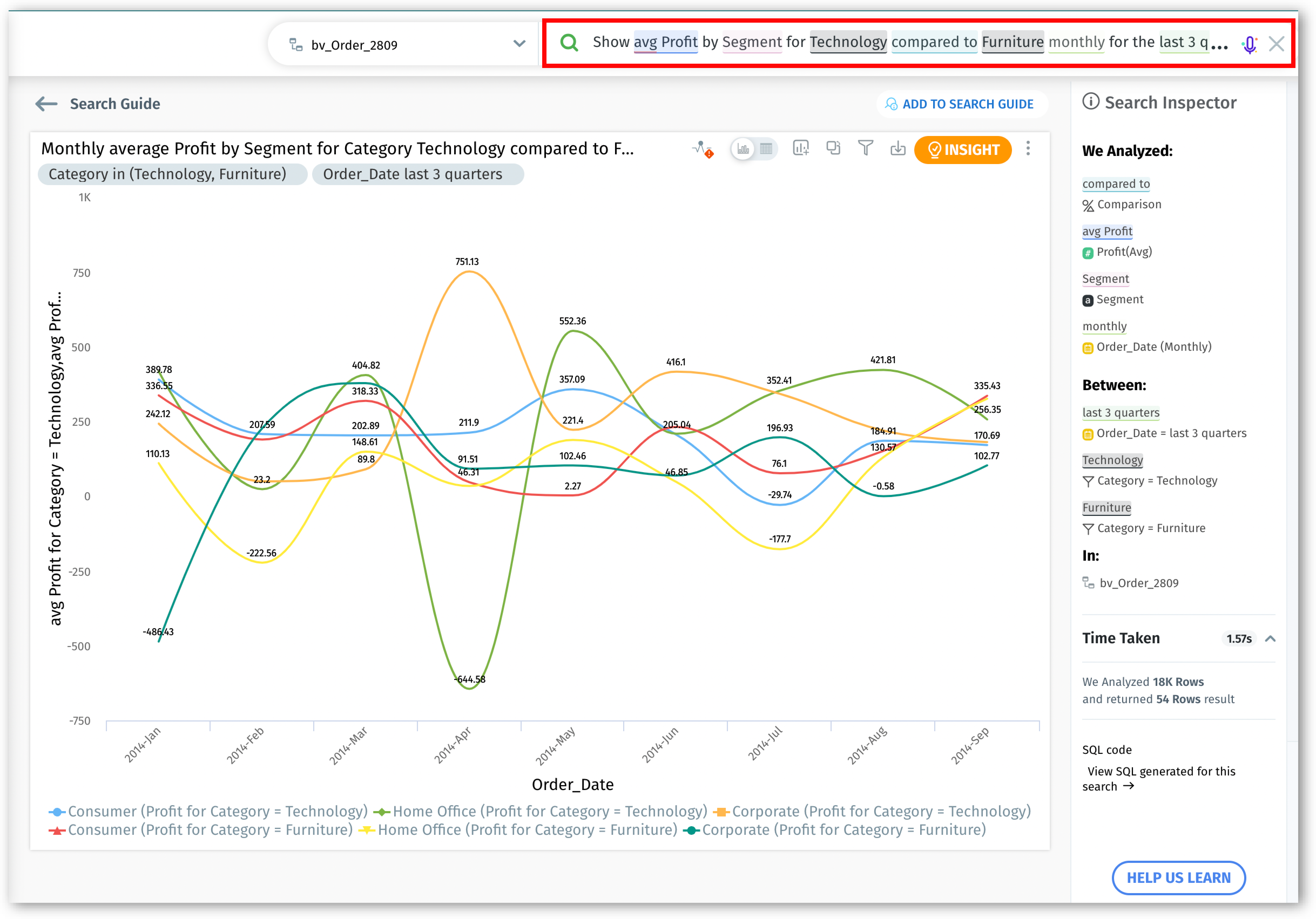 <figure><img src="https://content.gitbook.com/content/z4Tm2IzKyAiWUWiskgq5/blobs/ddRBBiYU8FhwX7Ur3LhX/Frame%2012%20(1).png" alt="" width="375"><figcaption><p><em>Show avg profit by segment for technology compared to furniture monthly for the last 3 quarters</em></p></figcaption></figure>