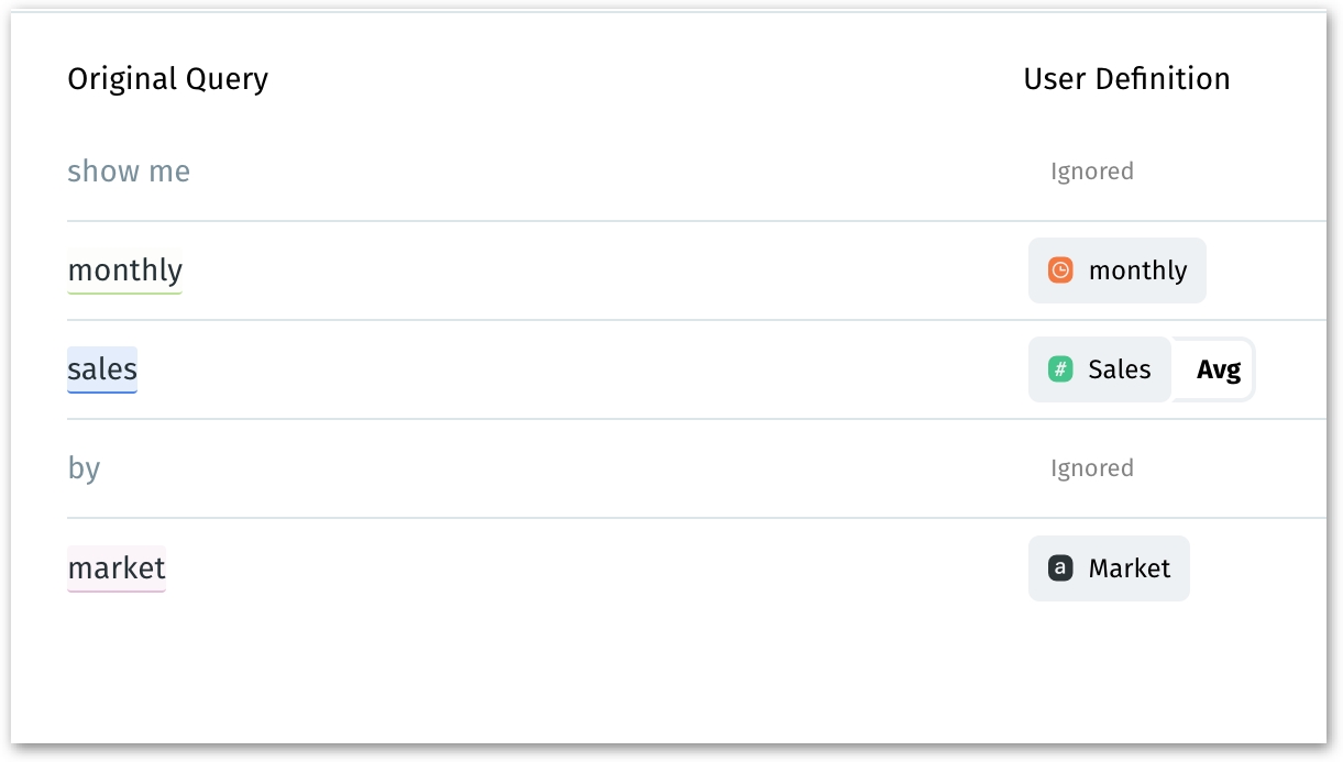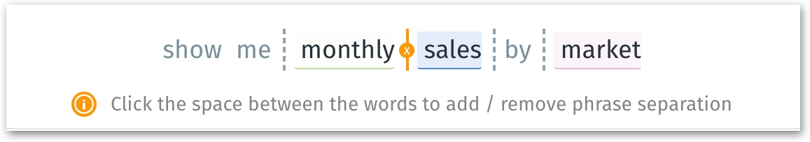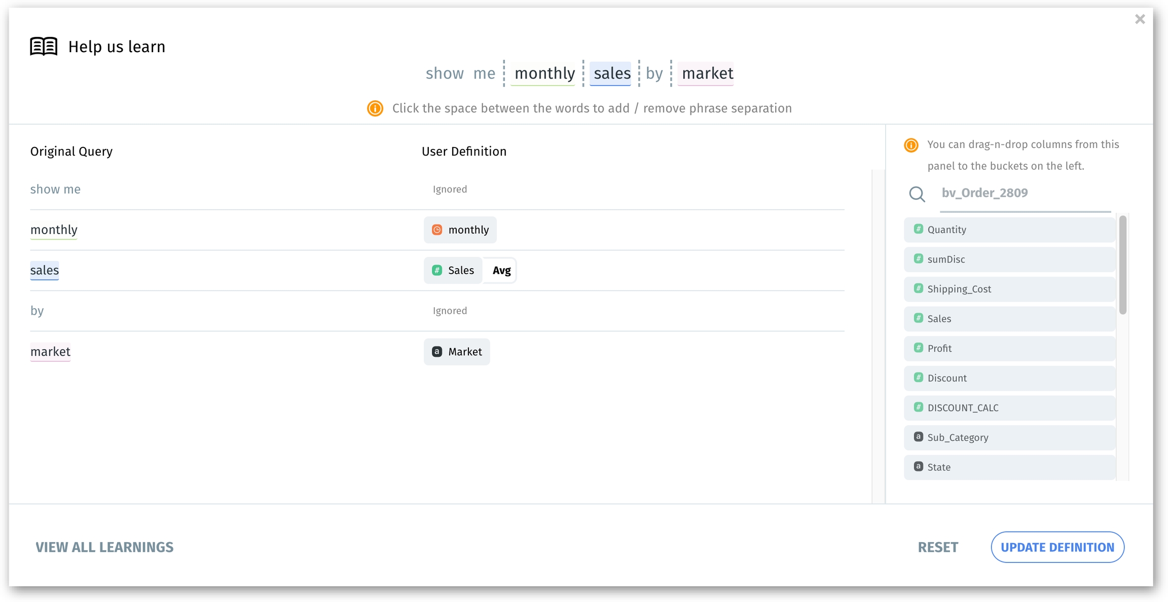 For instance, you could click between "regional" and "sales manager" to remove the space, creating a new term "regionalSalesManager". Instead of referring to "Region" and "Sales Manager" columns separately, Tellius will attempt to interpret this as a single term. This manipulation helps Tellius learn the nuances of your query language, allowing for more accurate data retrieval in the future.