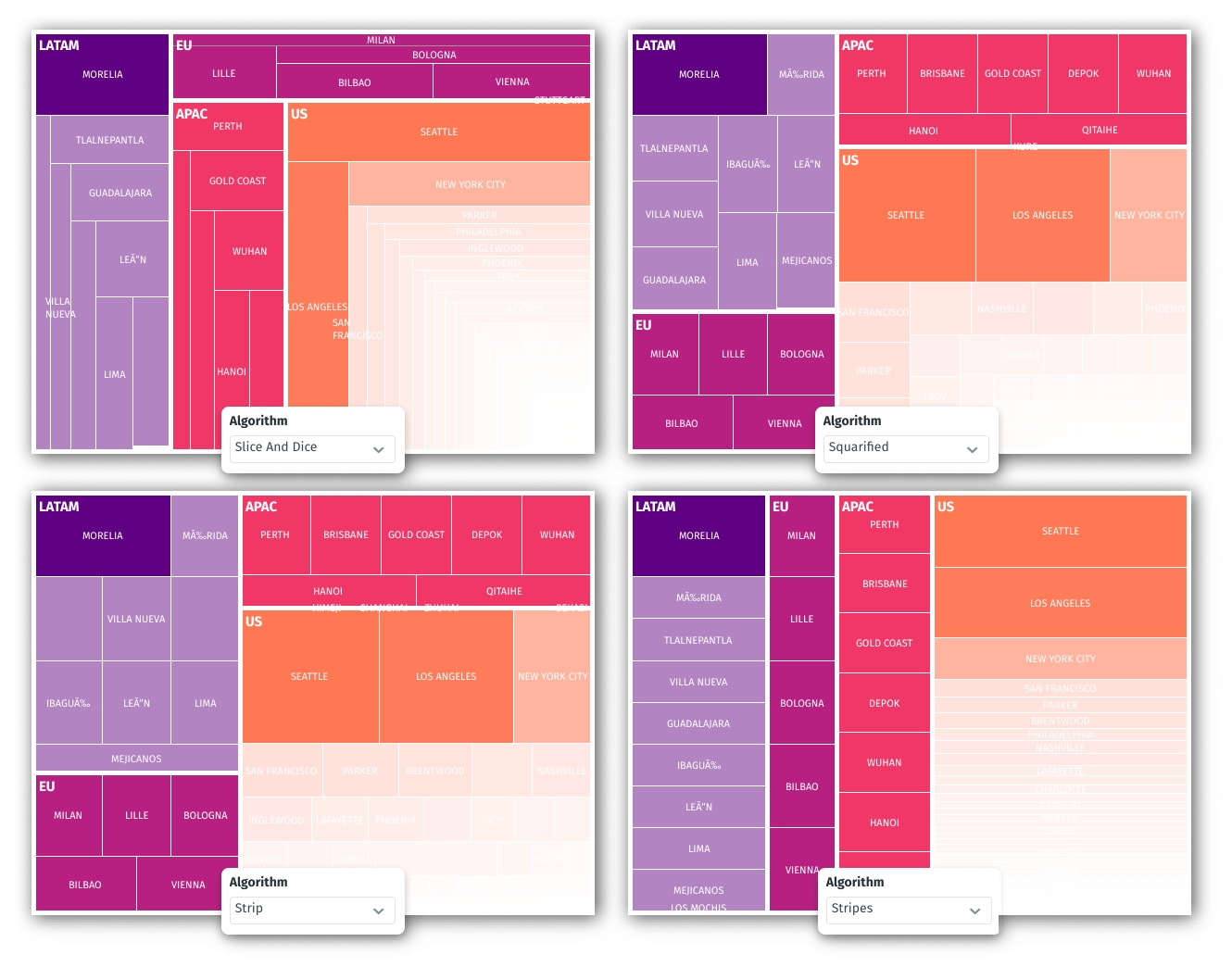 Algorithm: Tellius supports all four algorithms by Highcharts. Layout options such as stripes, slice and dice, squarified, and strip are provided to give users more control over the visual organization of data.