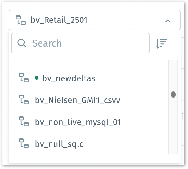 From the dropdown in the top left corner, choose the required Business View from the list. The Business Views can be sorted and searched.