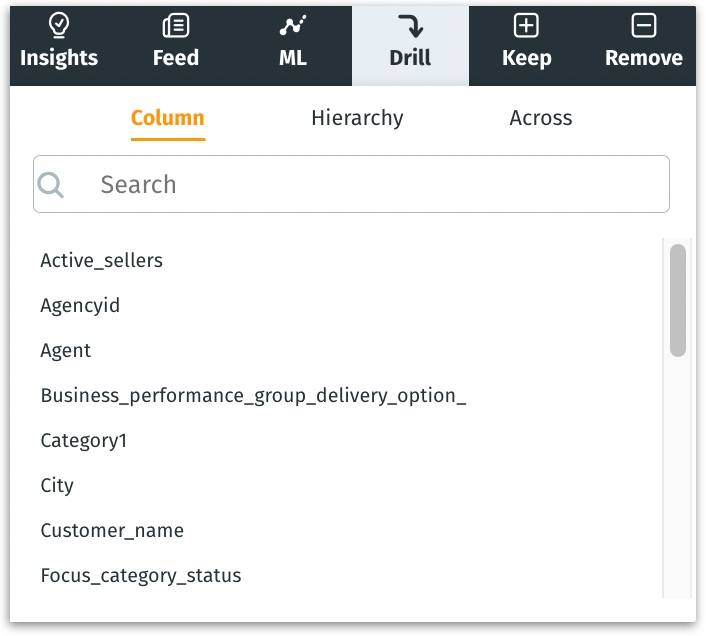 Drilling offers a granular view by changing the chart’s focus or applying the insight to other contexts. Drilling can be done by columns, hierarchy, or across Vizpads.