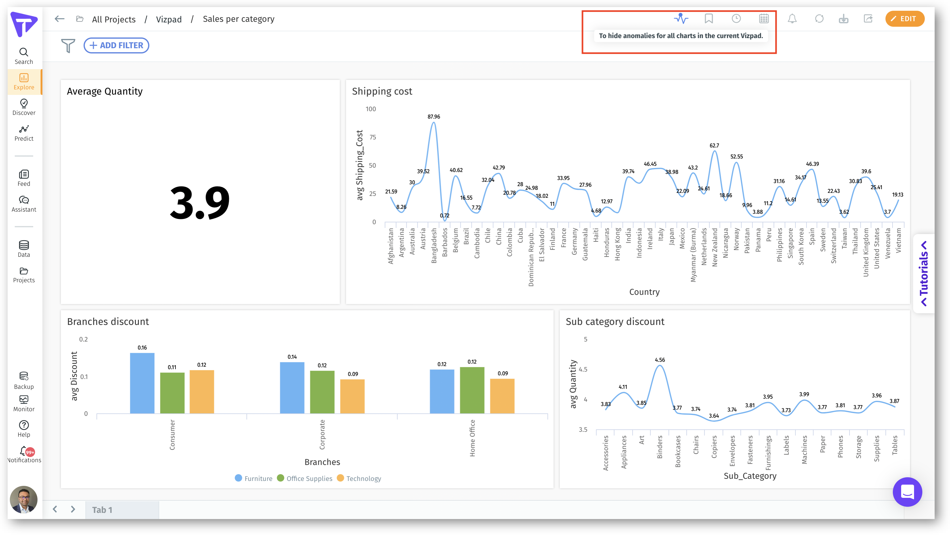 3. If the icon is enabled (blue in color), then anomalies will be displayed for line charts in the Vizpad.