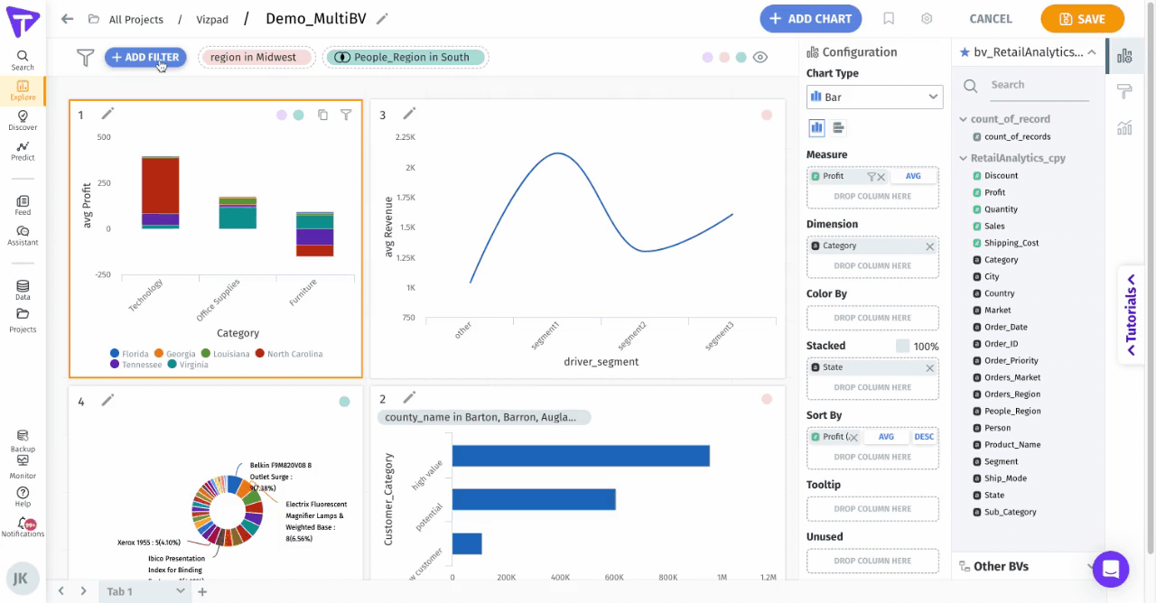 If you create a chart using a Business View (e.g., "*Customer Success*") that shares a common column (like <mark style="color:red;">"</mark>*<mark style="color:red;">revenue"</mark>*) for which a filter has already been applied, the chart will automatically use that *<mark style="color:red;">"revenue"</mark>* filter. This ensures your data remains consistent, and filters get reflected with newly created charts across different Business Views.