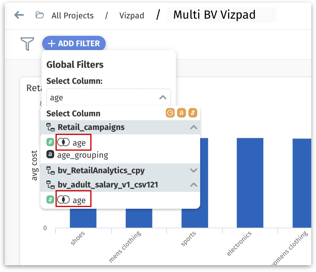 If you select any of the common columns that exist in multiple Business Views, then the filter will be applied to all the charts created from those Business Views. With this ability, you can intersect disparate Business Views without necessarily joining them.