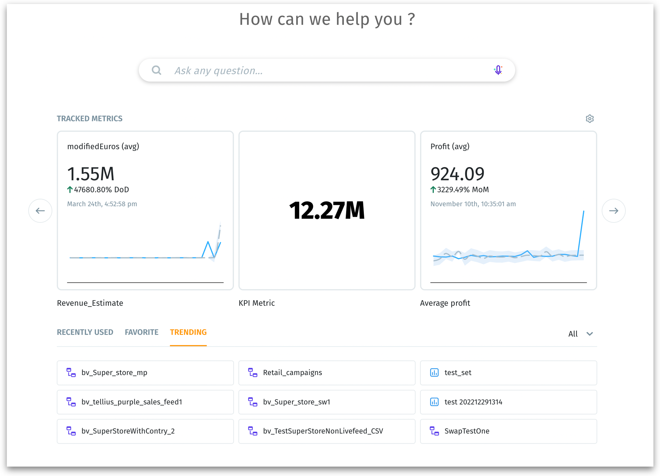 Tellius 5.4 introduces a redesigned home page—a centralized interface that enables users to quickly access their most critical resources and track essential KPIs.