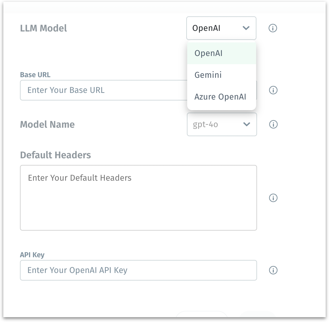 A new configuration interface allows admins to independently set up and manage LLMs—updating access keys, selecting models, and assigning defaults through a secure, role-based system. This simplifies LLM management, enhances operational control, and reduces reliance on external support.