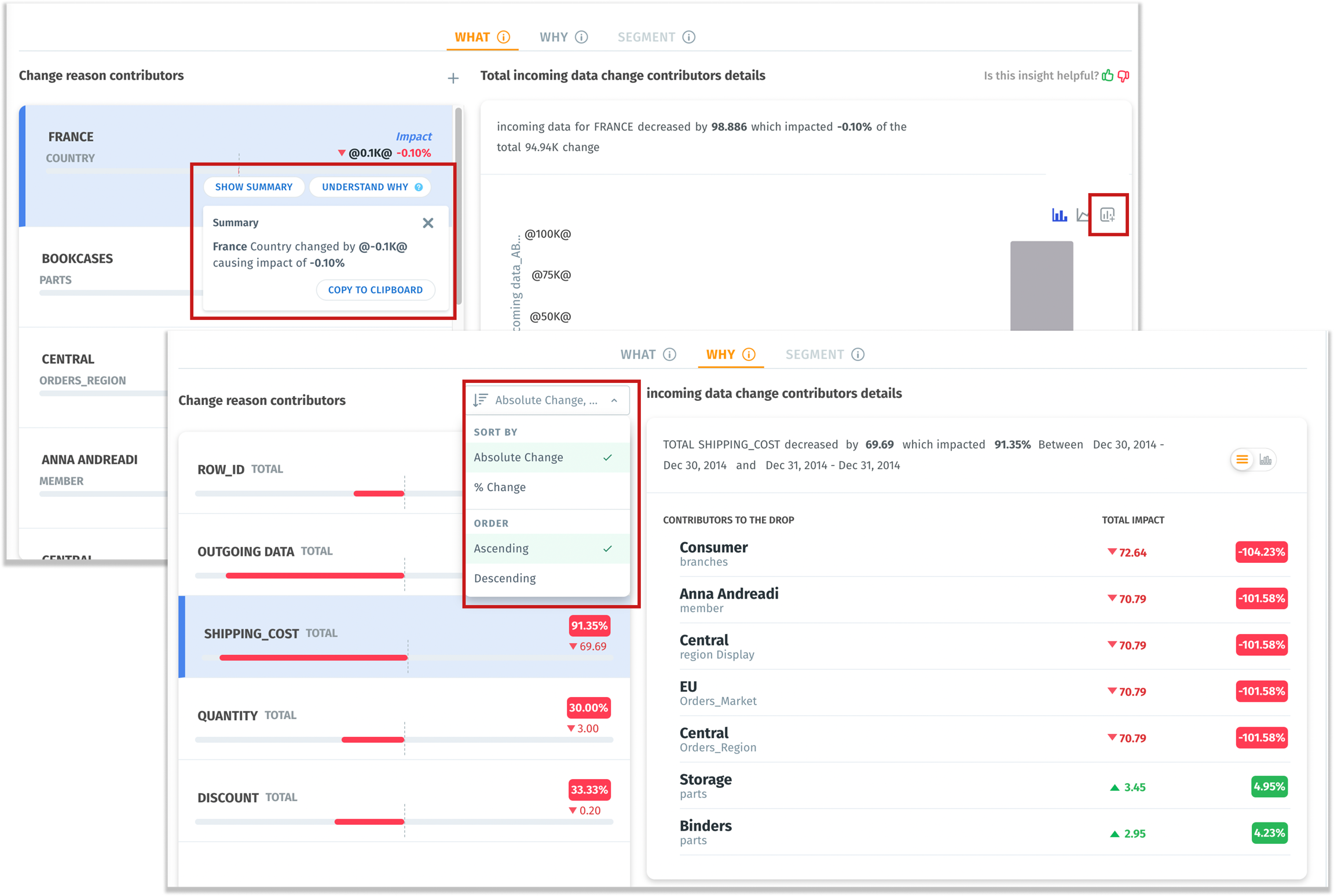 Easily adjust comparison periods, modify contributors, and explore drilldowns for more precise analysis. The "Top Reasons for Change" section has been removed to avoid confusion, streamlining your insights view.