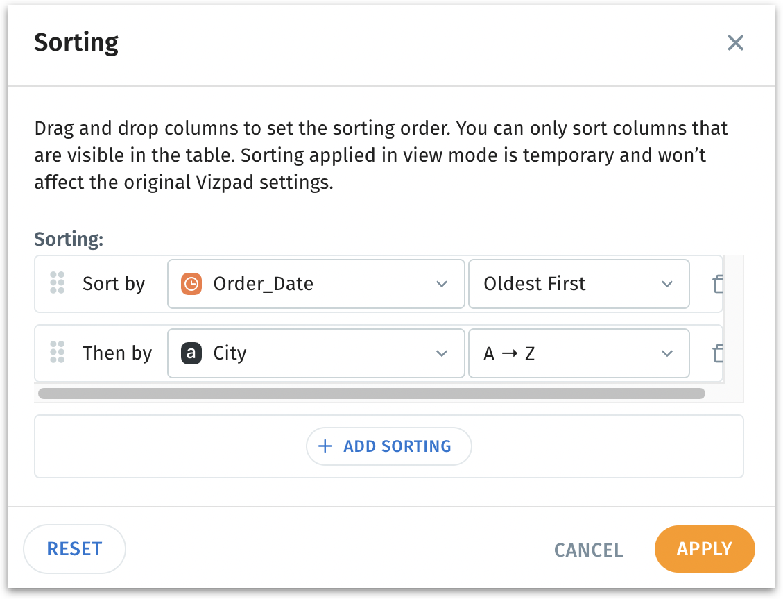 Vizpads now enable multi-column sorting in table (tables and detail tabled) visuals, even in View mode. This enhancement adds a dedicated multi-sort icon to tables and detailed tables, allowing you to select columns and define sorting orders effortlessly. The columns that are visible to you can only be sorted. The column header sort icon now toggles between ascending and descending with just one click, making the sorting process faster and more intuitive. The ascending and descending icons have been removed for every column and will be visible only for columns where the sorting is applied.
