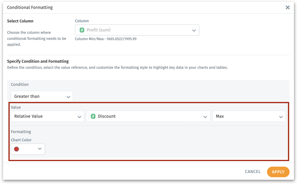 Vizpads now enhances conditional formatting by allowing you to compare against aggregated values from other columns, helping teams quickly identify areas that need attention. Previously, formatting was limited to static, hard-coded values, but with this update, you can set conditions that dynamically compare one column’s values to another’s aggregated results—similar to the existing benchmark functionality in bar charts.