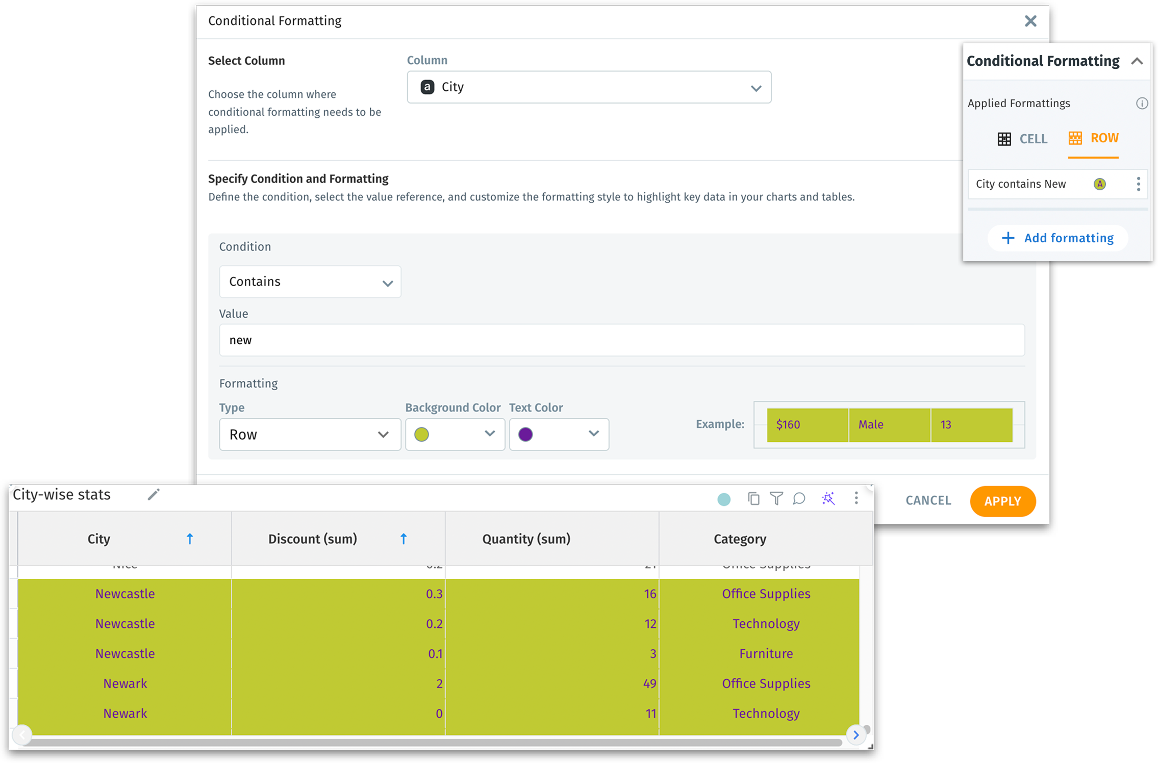 To avoid conflicts, if overlapping conditions are applied to the same row, Tellius prompts you to prioritize which condition should take effect. Similarly, if you attempt to delete a column with an active formatting rule, an alert ensures you confirm the action to avoid accidental loss of formatting. Cell level is prioritized.