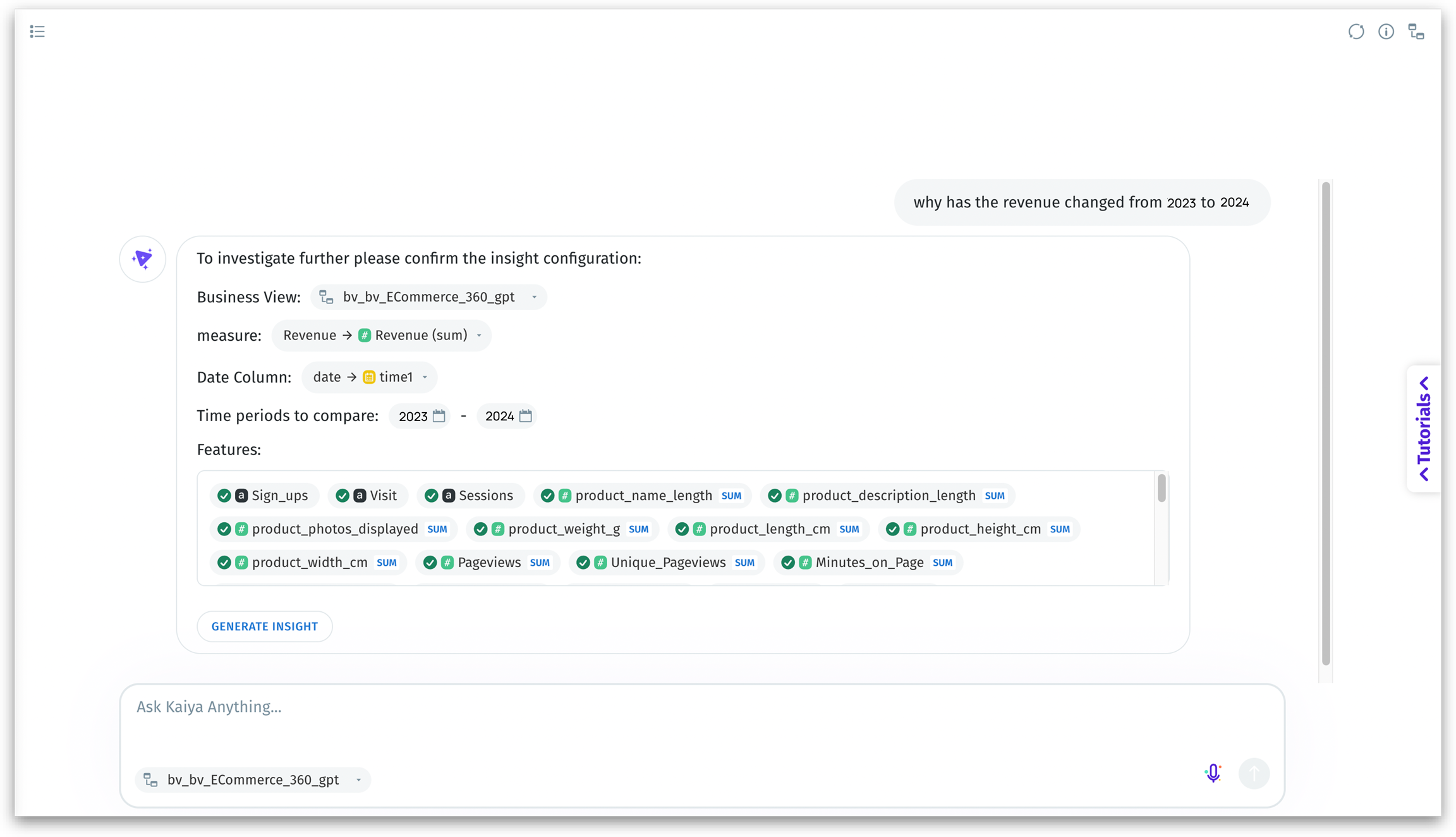 Tellius 5.4 takes Kaiya's conversational analytics to the next level by enabling intent-driven insights generation. Users can now ask deeper, "why" questions—like "Why did sales drop last quarter?"—and Kaiya will intelligently detect the intent, identify whether the user seeks trends, segments, or comparisons, and proceed to generate detailed, actionable insights. Kaiya confirms the analysis path, remembers the context from previous queries, and ensures that insights align with user expectations. This makes the experience more conversational and dynamic, reducing the need for multiple back-and-forth clarifications.