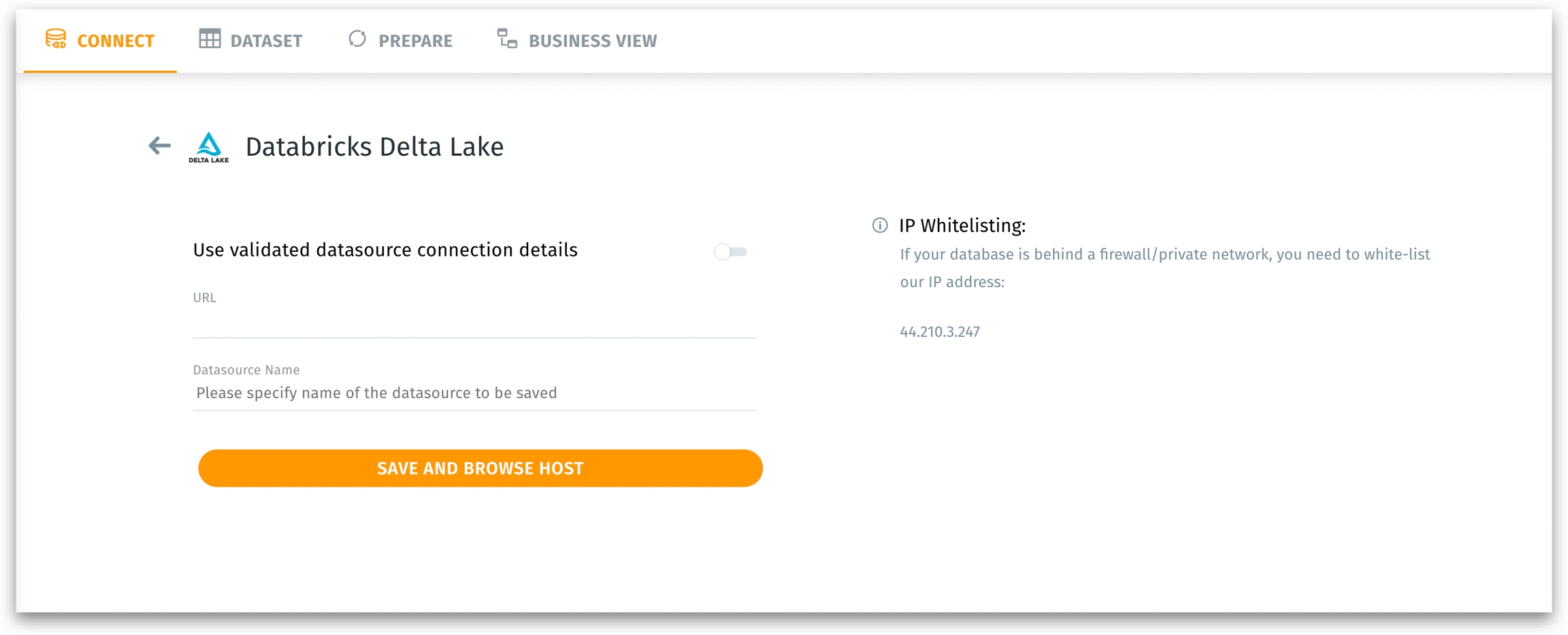 Use validated datasource connection details: When enabled, it reveals a dropdown to choose from existing, previously configured Delta Lake connections.