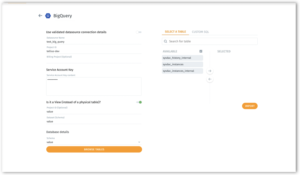 Enable the Use validated datasource connection details toggle if you want to connect to an already established connection.