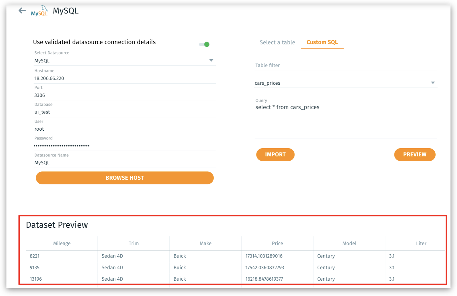 Select datasource: Lists all pre-validated MySQL connections. Select the one you want to reuse and all the fields will be filled automatically as configured.