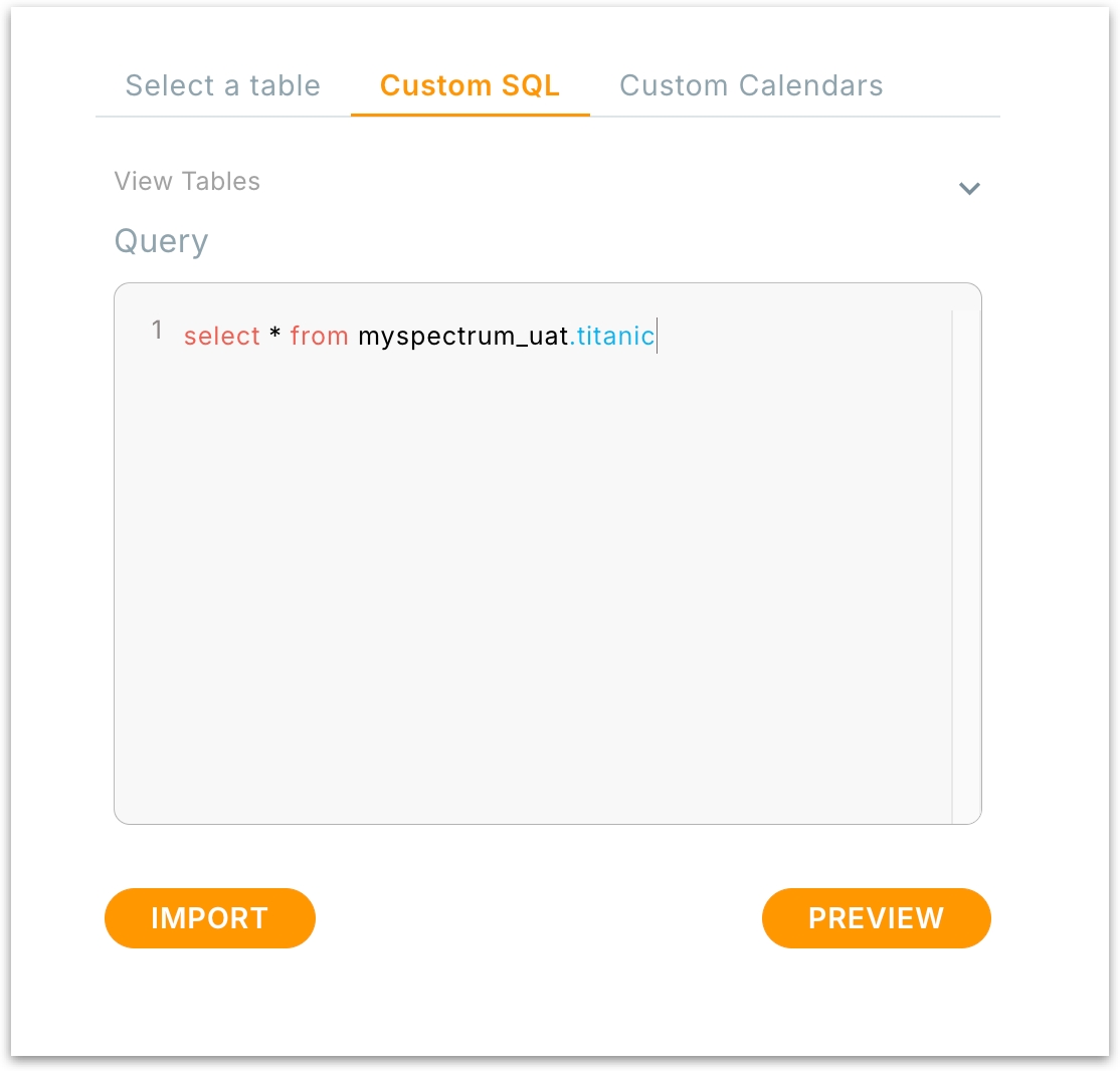Either select from the list of available tables or use Custom SQL section to preview and import the required table(s).