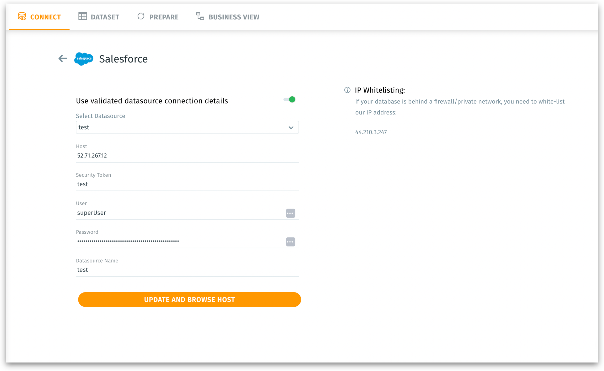 Use validated datasource connection details: When enabled, it reveals a dropdown to choose from existing, previously configured Salesforce connections.