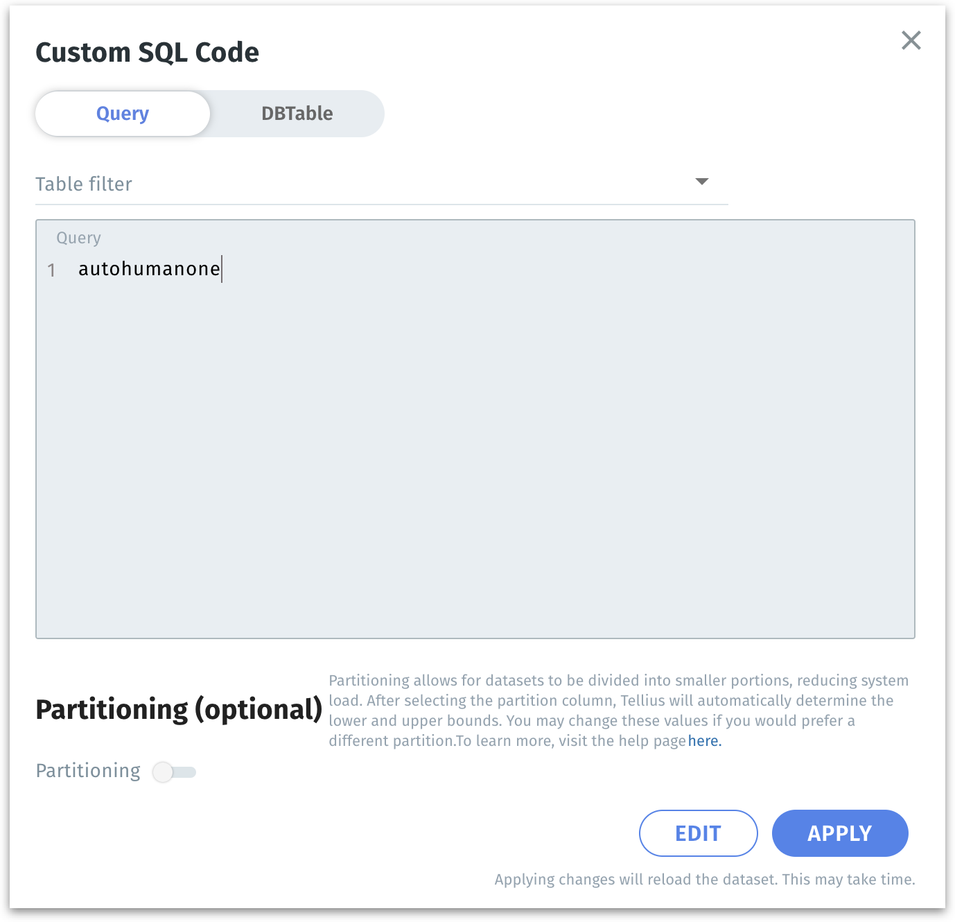 * Below the **Query** section, you’ll find the **Partitioning** (optional) toggle. Partitioning divides the dataset into smaller chunks based on a chosen numeric column. This can vastly improve performance and reduce load times on large datasets.