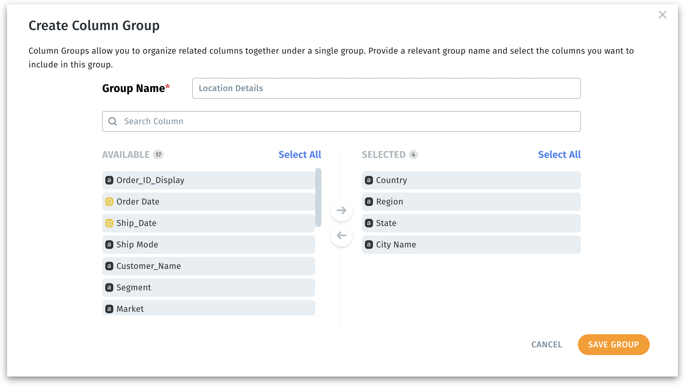 Select columns from an “Available” list and move them to the “Selected” section to form the new group.