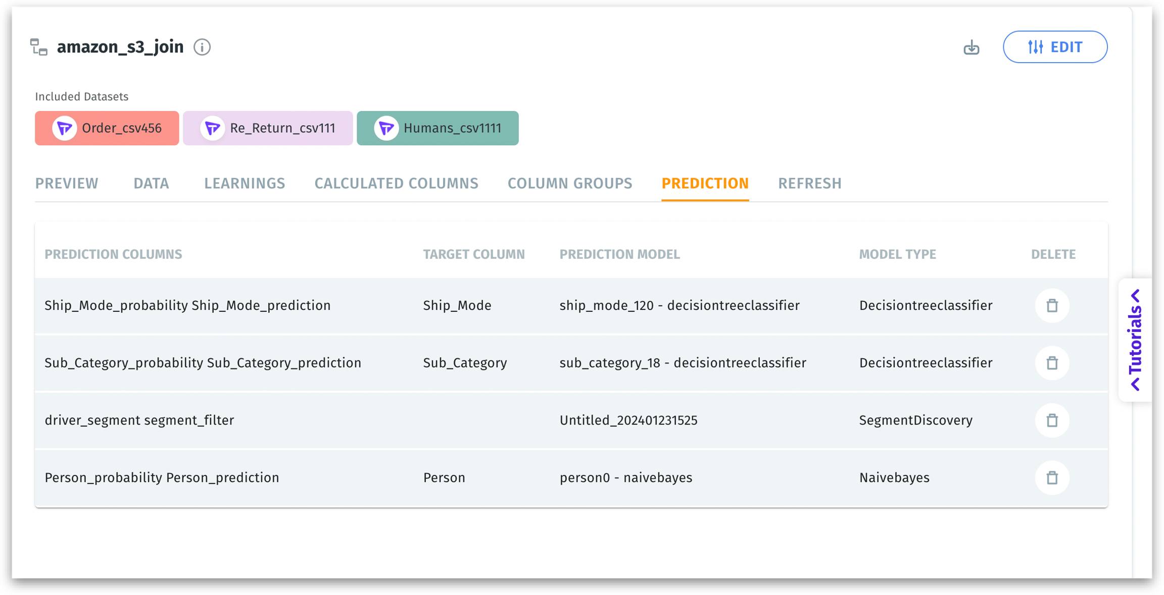 When you have ML models applied to the dataset(s) within a BV, this tab displays the newly generated prediction columns, the target column used for modeling, and details about the prediction model itself.