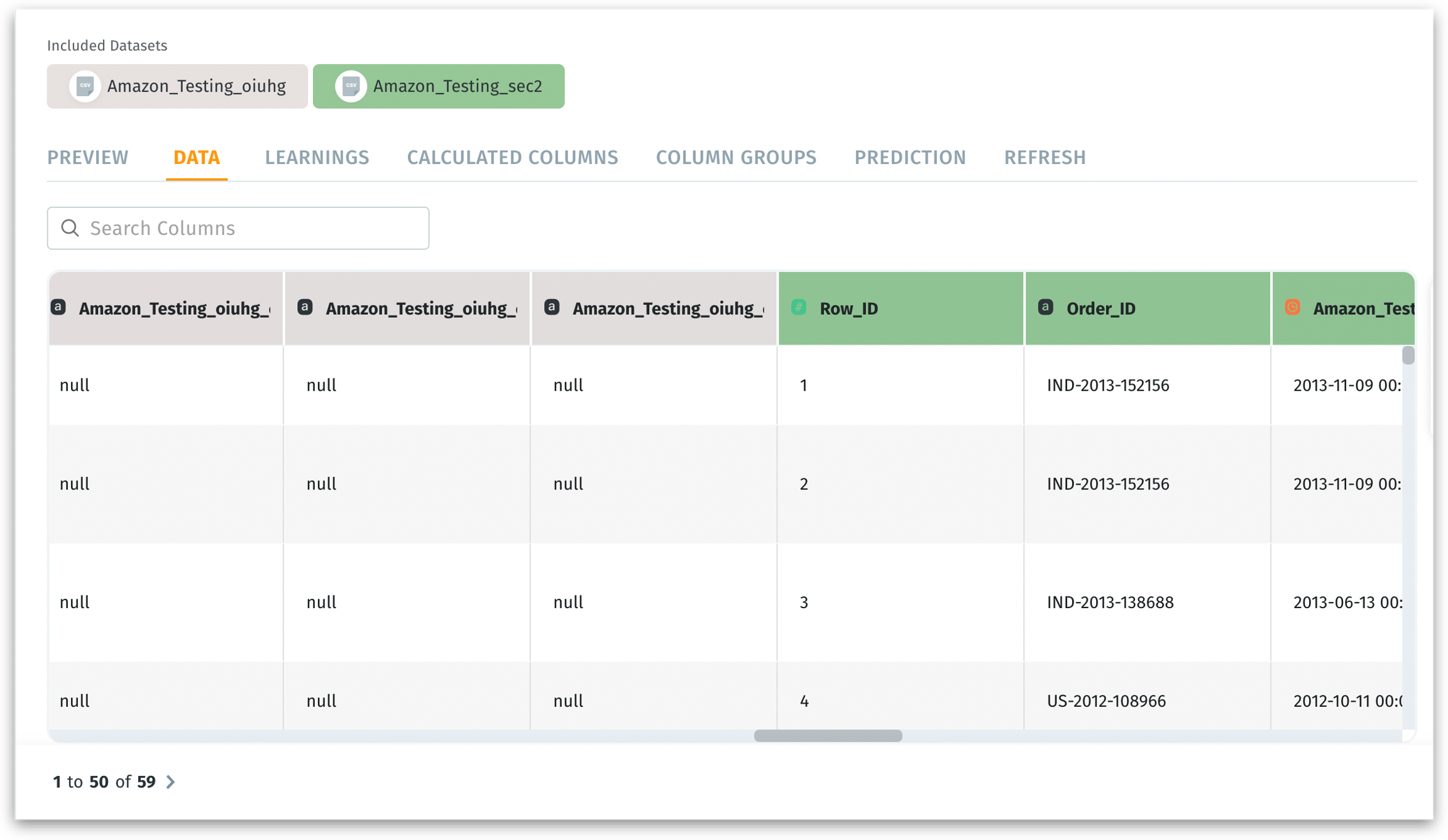 The color of each column header in the data table corresponds to the color of its associated dataset listed in the "Included Datasets" section. In the image given below, you can see that the color of the column header "Row_ID" is the same as its associated dataset "Amazon_Testing_sec2".