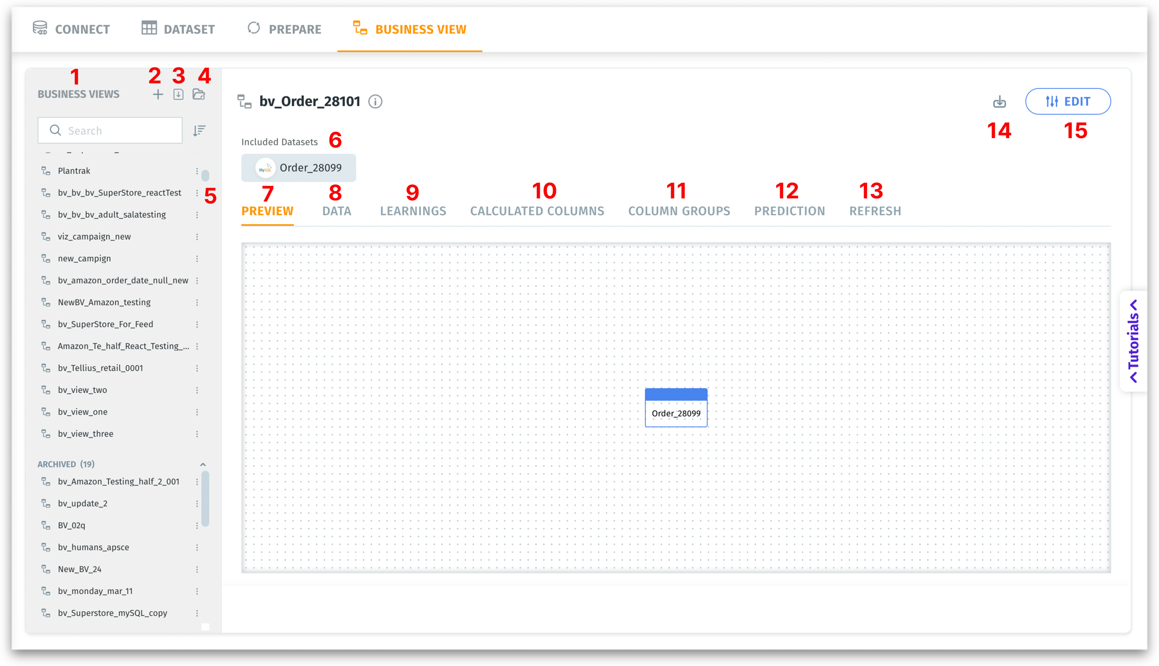 Edit: Clicking the Edit button in a Business View opens the editing interface, allowing you to modify and enhance your BV. You can update existing columns, add or remove datasets, and make other adjustments to align the BV with your analytical needs.