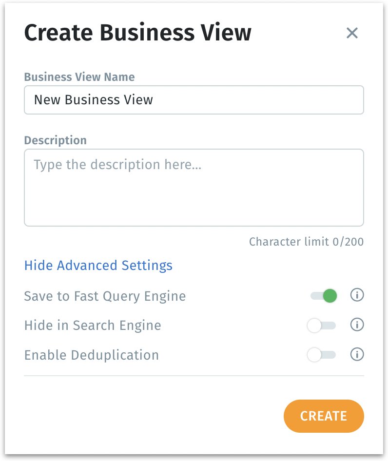 Edit: The following window will be displayed, where you can edit the name, description, and advanced settings of the selected Business View. For more details about the options displayed, check out this page.