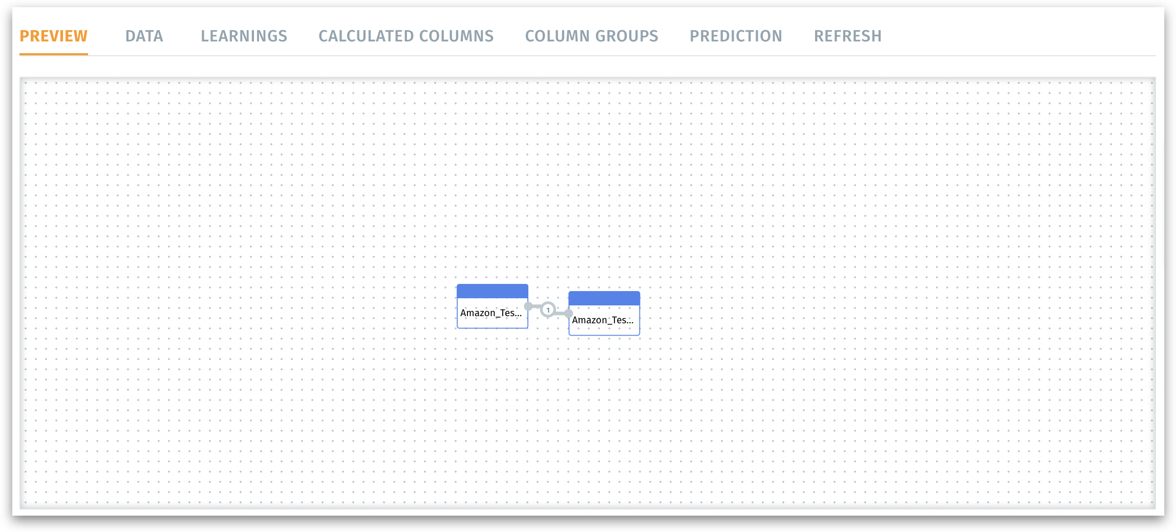 Preview: A visual overview of the datasets included in this Business View. Each dataset is typically shown as a node on a canvas, especially if you have more than one dataset. You can see how datasets are joined or related (if there are multiple datasets). This helps you confirm you’re working with the right underlying data source(s) before you configure additional settings.