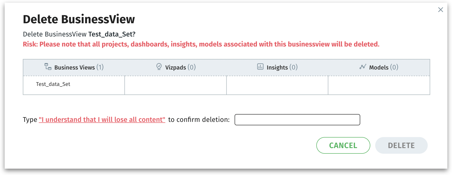 Click on Delete to permanently remove the Business View and all listed objects (Business Views, Insights, etc.) or click on Cancel to discard. Once deleted, this action is irreversible.