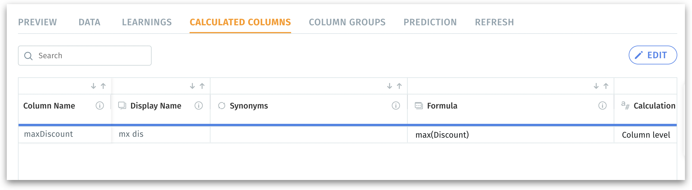 You can search for the required calculated column and each column displayed in the table can be sorted in ascending or descending order. In **Edit** mode, you will get **Undo** and **Redo** buttons left to the search bar for reverting or reapplying changes made to the calculated columns, ensuring flexibility and control over your edits. Each row in this table shows the following: