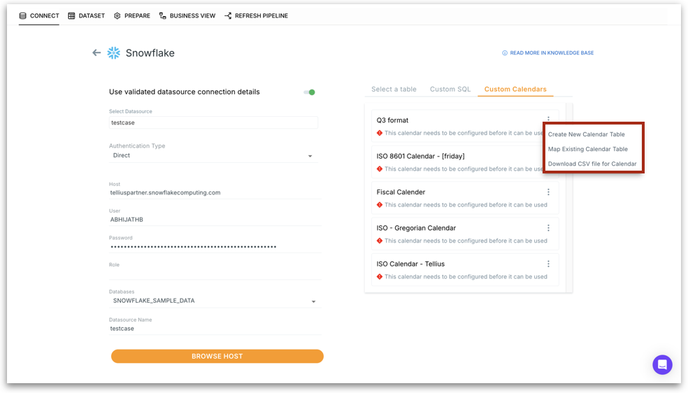 When configuring your Snowflake, Redshift, BigQuery, and Spark SQL connection to view and manage available fiscal or custom calendar options. Under Data → Connect → Custom Calendars, you'll see a list of predefined calendars (e.g., ISO 8601, Gregorian, Q3 format, Fiscal Calendar).