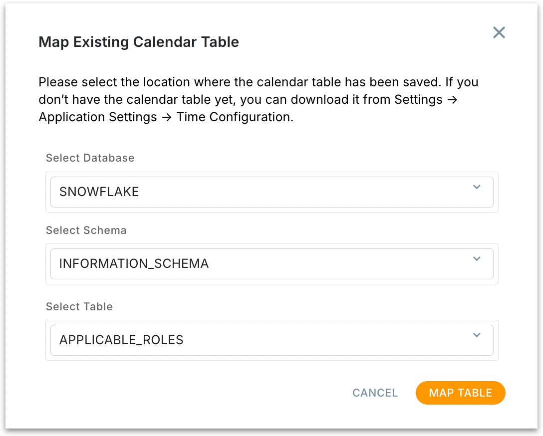 Map: If your calendar table already exists (manually created or loaded from CSV), simply point Tellius to it—no write access required.